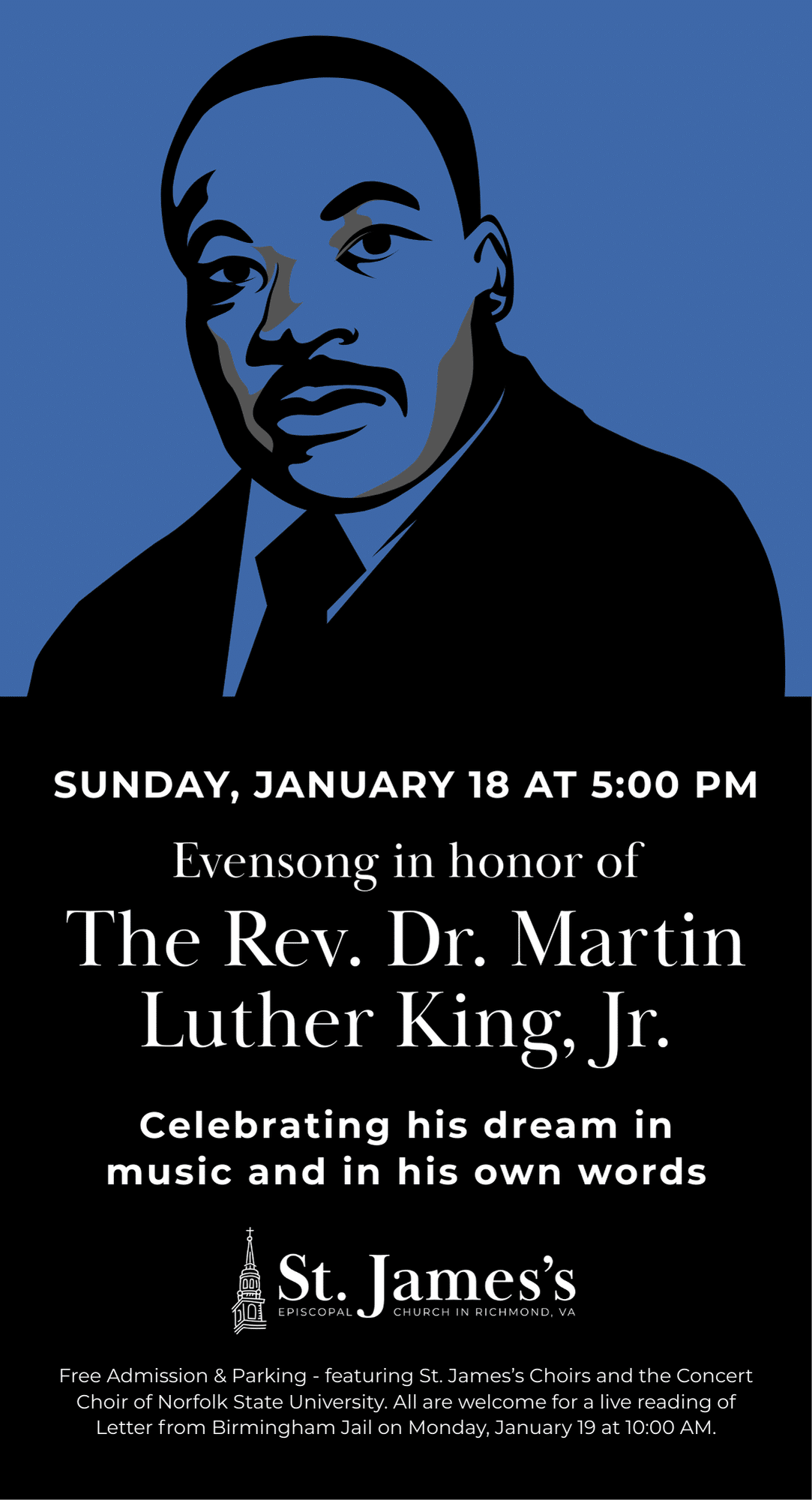 Come and celebrate the dream of Dr. King in music and in his own words. Featuring St. James’s Choirs and the Concert Choir of Norfolk State University.