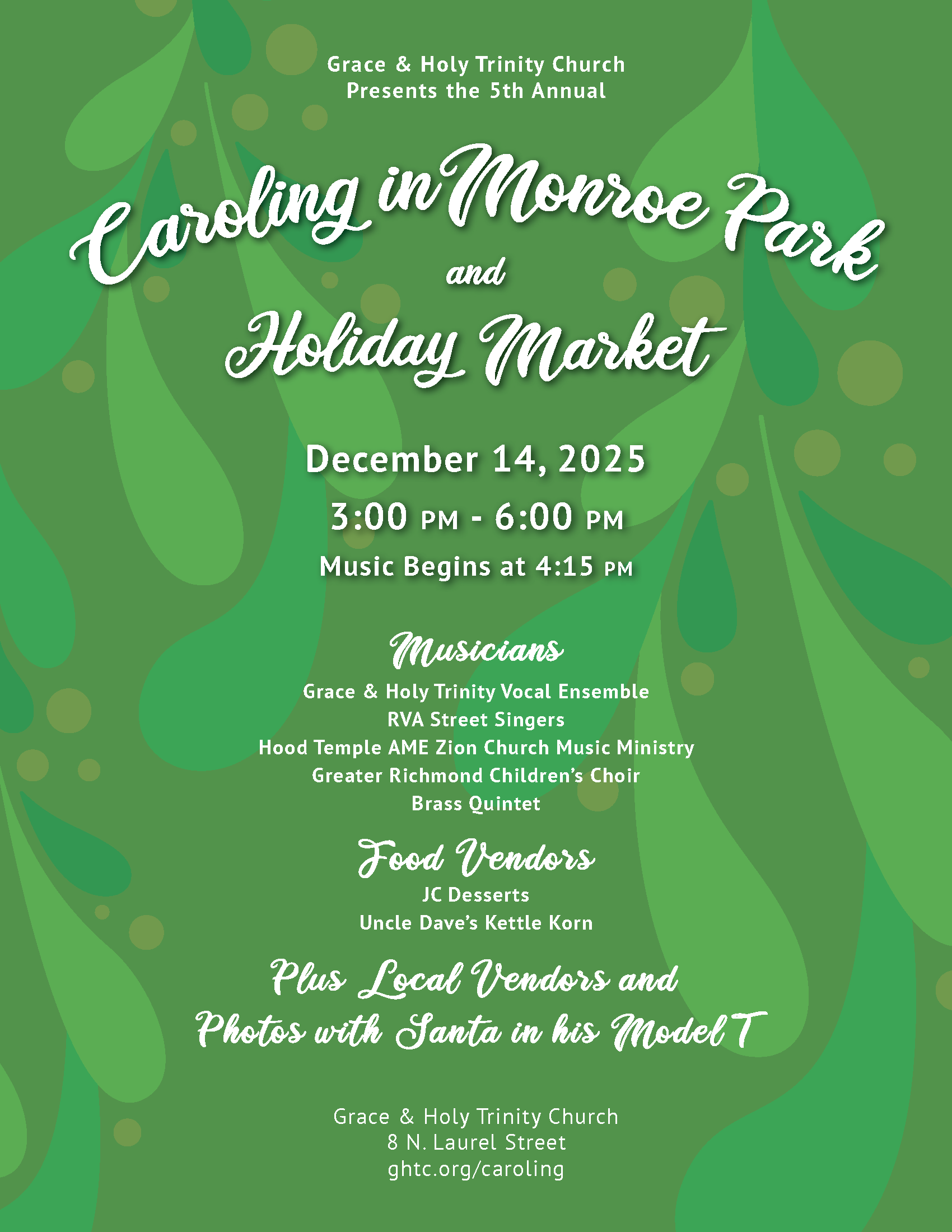 GHTC’s Caroling in Monroe Park & Holiday Market brings The Greater Richmond Children’s Choir (GRCC), Hood Temple AME Zion Church Music Ministry, RVA Street Singers, the GHTC Vocal Ensemble, and a brass quintet together to lead us in carols for this fifth annual holiday event on Sunday, December 14th. There will be a holiday market with local vendors, Uncle Dave’s Kettle Korn, JC Desserts, and a Red Door Ministry Clothes Closet giveaway shop. Ornament painting, photos with Santa in his Model T, and fun children’s activities start at 3:00 p.m. The brass quintet will begin at 4:15 p.m., with caroling following at 4:30 p.m.