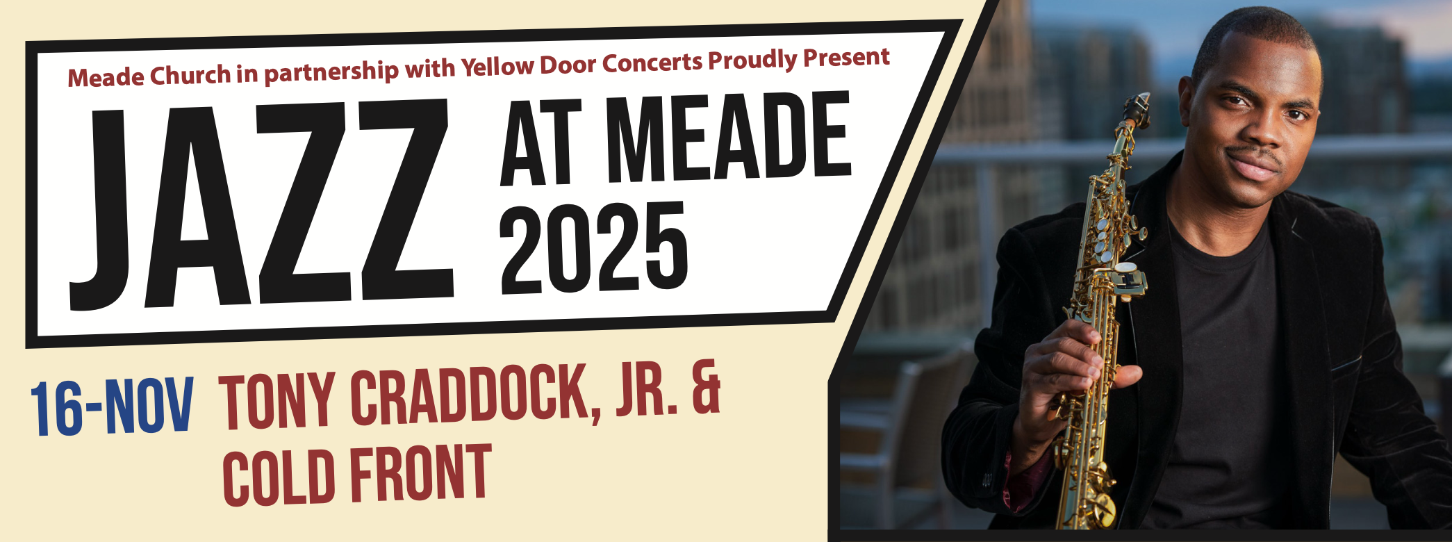 Meade Church in partnership with Yellow Door Concerts presents Jazz at Meade. All concerts are held on Sunday afternoon from 4-6 pm. Light refreshments/Street parking. Featured Artist on November 16th is Tony Craddock, Jr. & Cold Front (See websites for more information about the artist).