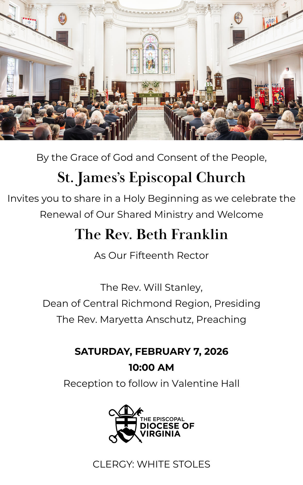 By the Grace of God and Consent of the People, St. James’s Episcopal Church invites you to share in a Holy Beginning as we celebrate the Renewal of Our Shared Ministry and welcome The Rev. Beth Franklin as our 15th Rector. The Rev. Will Stanley, Dean of Central Richmond Region, will preside. The Rev. Maryetta Anschutz will preach. Reception to follow in Valentine Hall. Clergy are encouraged to wear white stoles.