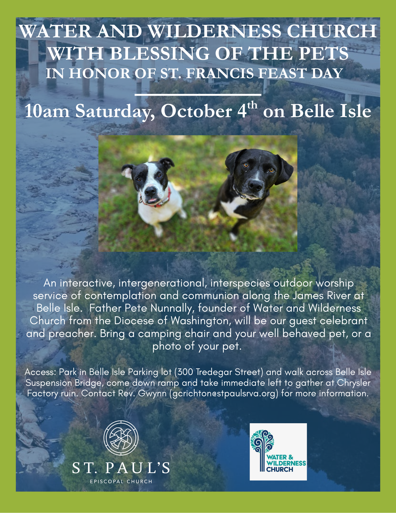 An interactive, intergenerational, interspecies outdoor worship service of contemplation and communion along the James River at Belle Isle. Together, we will give thanks to God our Creator, bless God’s creatures, and pray for the healing for God’s good creation. Father Pete Nunnally, founder of Water and Wilderness Church from the Diocese of Washington, will be our guest celebrant and preacher. Bring a camping chair and your well behaved pet, or a photo of your pet.