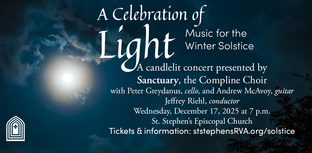 Sanctuary, the Compline Choir of St. Stephen’s Church in Richmond, presents its annual concert for the winter solstice, “A Celebration of Light.” The choir is led by interim conductor Jeffrey Riehl, and will also feature Peter Greydanus, cello, and Andrew McAvoy, guitar.
