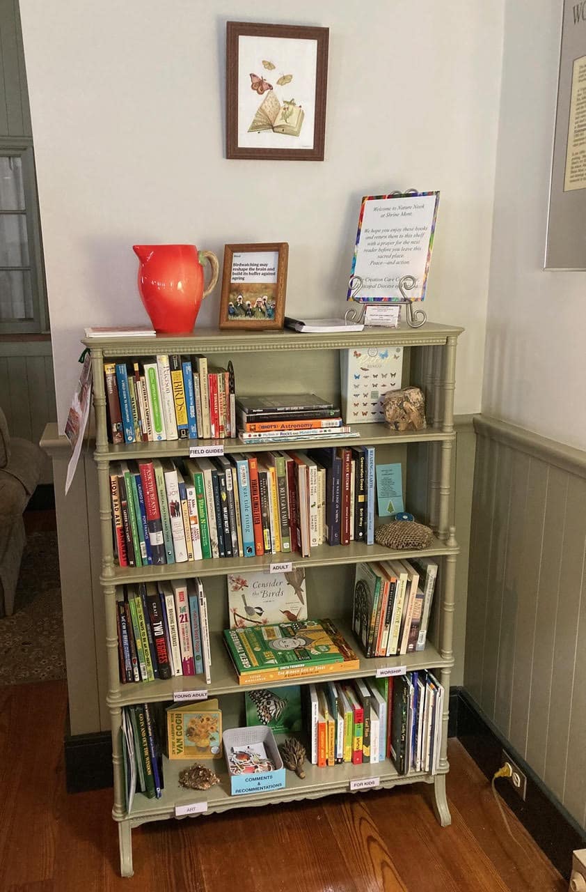 The Nature Nook, located in the lobby of the Virginia House at Shrine Mont, is a library of field guides, worship, and creation care resources. The Creation Care Committee created the Nature Nook for your enjoyment during your stay at Shrine Mont. Feel free to peruse the books, and share your comments and recommendations for new books to