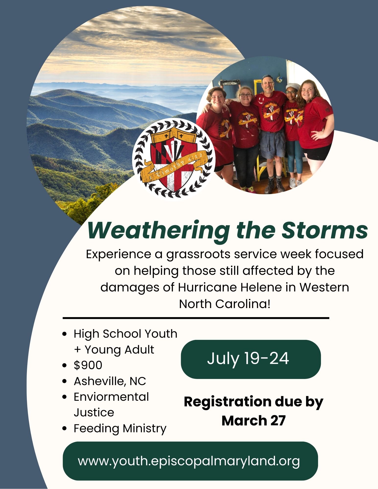 The Episcopal Diocese of Maryland invites high school students and young adults in Province III, which includes the Episcopal Diocese of Virginia, to join in a week of service this summer. “Weathering the Storms” will focus on helping people still affected by the damages of Hurricane Helene in Western North Carolina. The trip is July 19-24, and cost is $900. Registration closes March 27. Read the overview. Learn more.