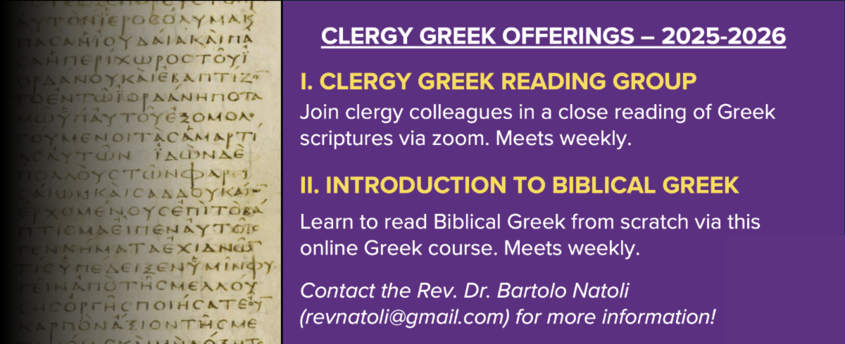 This year, The Rev. Dr. Bart Natoli (Randolph-Macon College) will lead two free Greek courses for clergy to engage with Scripture on a deeper level. Both courses will be led by the Rev. Dr. Bart Natoli, Professor of Classics